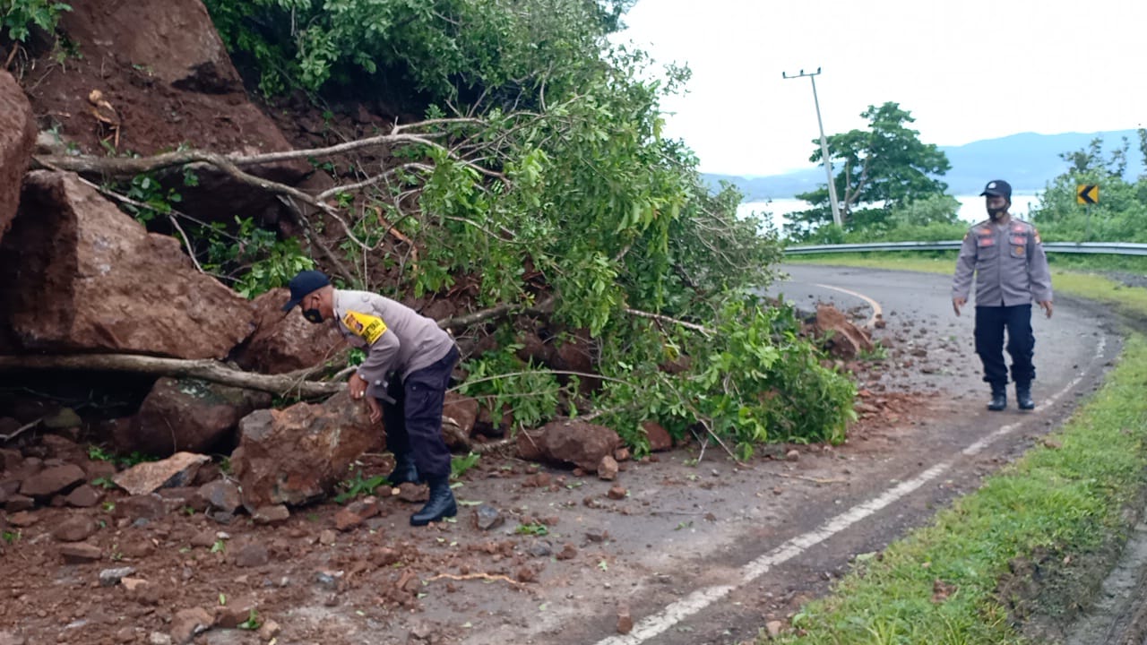 Selain mengatur arus lali lintas, petugas juga sedang berupaya memindahkan material longsor yang menutupi ruas jalan tersebut.