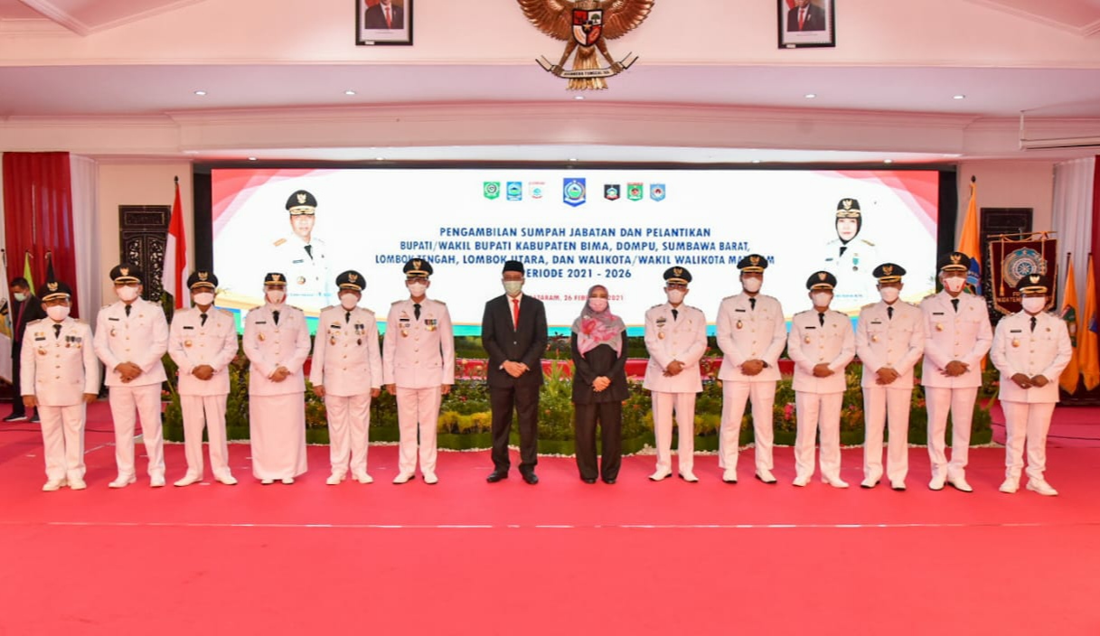 Enam pasangan kepala daerah yang dilantik tersebut diantaranya, Walikota/Wakil Walikota Mataram H. Mohan Roliskana, .S.Sos., M.H. – TGH. Mujiburahman. Bupati/Wakil Bupati Lombok Utara H. Djohan Sjamsu, S.H. – Danny Karter Febrianto R, S.T., M.Eng., Bupati/Wakil Bupati Lombok Tengah H Lalu Pathul Bahri – H. M. Nursiah. Bupati/Wakil Bupati Sumbawa Barat Dr. Ir. H. W. Musyafirin, MM – Fud Syaifuddin, ST. Bupati/Wakil Bupati Dompu Kader Jaelani – H. Syahrul Parsan, ST., MT, serta Bupati/Wakil Bupati Bima Hj. Indah Damayanti Putri, S.E – Drs. Dahlan M. Noer.