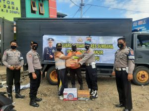 Sumbawa, – Kepolisian Resor Sumbawa menyalurkan bantuan sosial untuk korban banjir di Kecamatan Hu’u, Kabupaten Dompu, Jumat (5/3/2021).