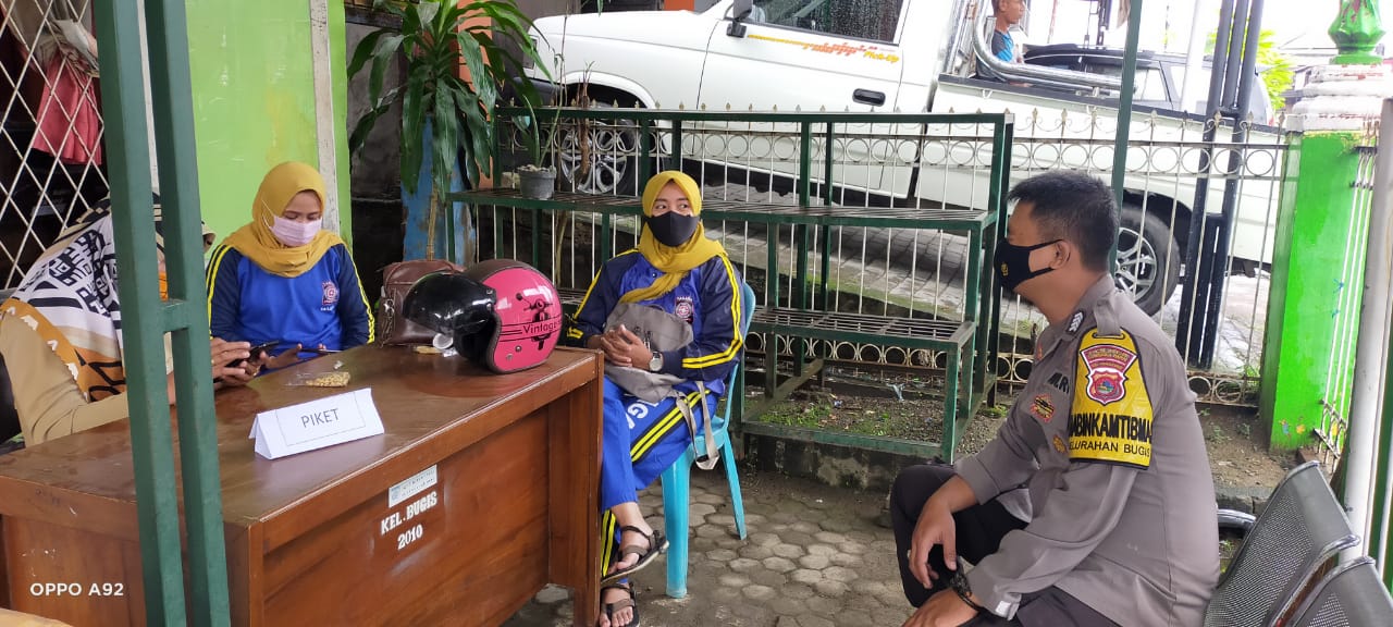 Bripka Eka menyambangi petugas piket Posko PPKM Mikro di kantor Kelurahan Bugis untuk mensosialisasikan sejumlah program pemerintah.