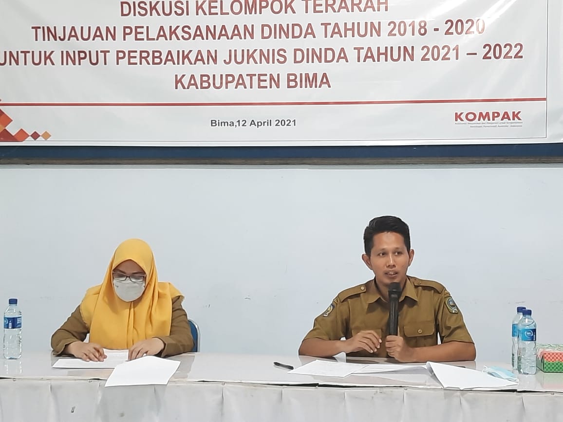 Bima, – Diskusi Kelompok Terarah/Focus Discussion Group (FGD) Tinjauan Pelaksanaan Dana Insentif Desa (DINDA) untuk Input Perbaikan Petunjuk Teknis (Juknis) DINDA tahun 2021-2022, kerjasama Program Kolaborasi Masyarakat dan Pelayanan untuk Kesejahteraan (KOMPAK) dengan Pemerintah Kabupaten Bima, dilaksanakan secara daring dan tatap muka di aula SMIK Kota Bima, Senin (12/4/2021).