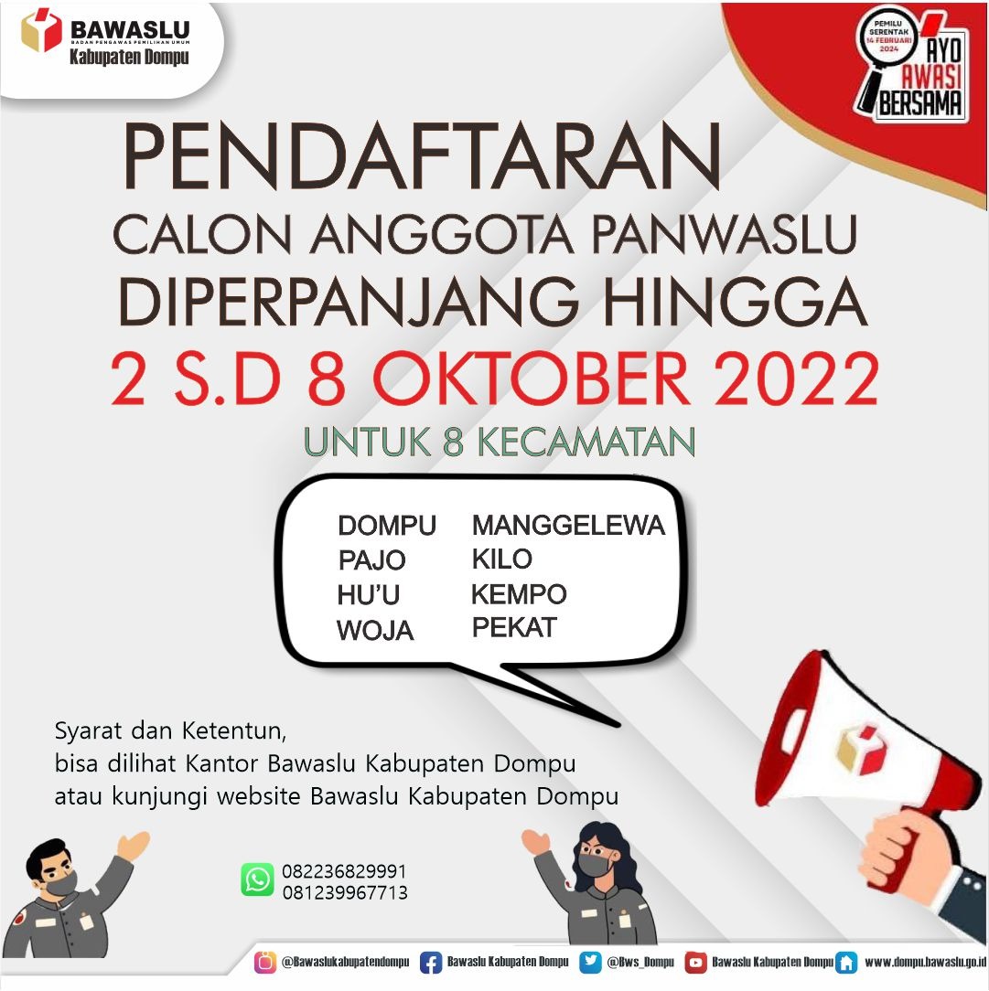 Dompu, – Badan Pengawasan Pemilu (Bawaslu) Kabupaten Dompu memperpanjang pendaftaran calon Panitia Pengawas Pemilu Kecamatan (Panwascam).