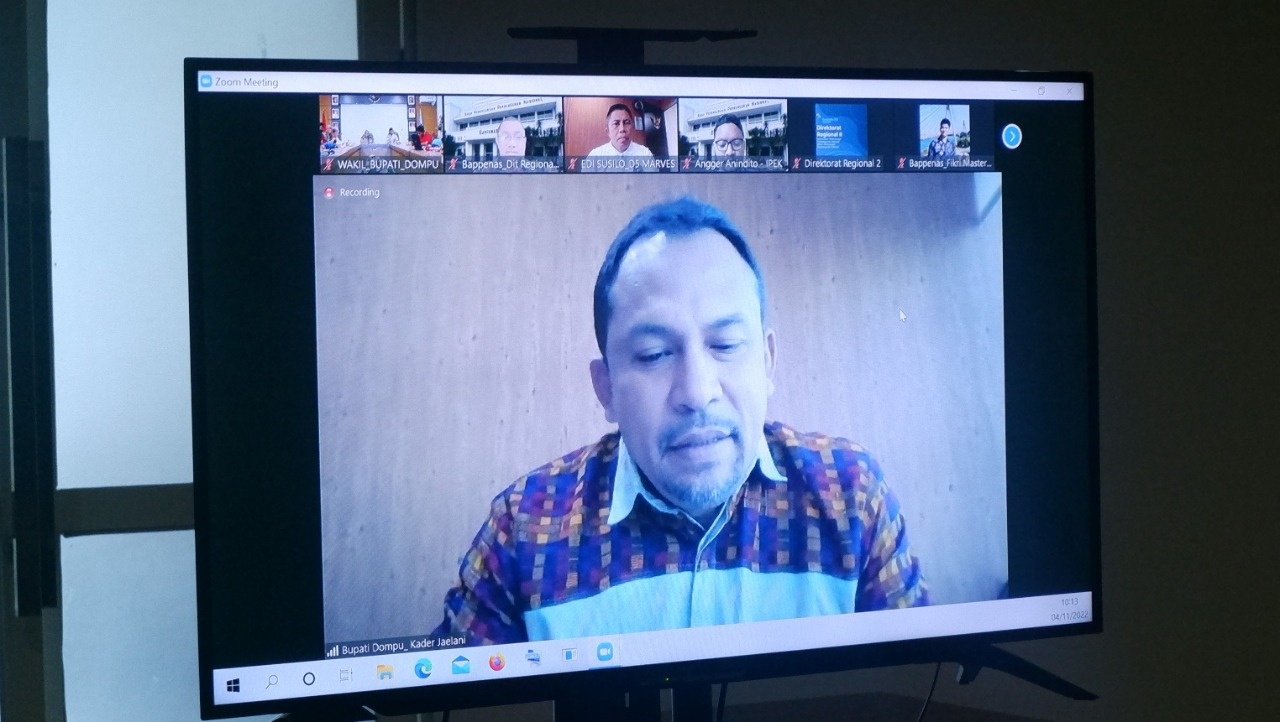 Jum’at (04/11/22) Bupati Dompu, H. Kader Jaelani, melalui aplikasi vidio confrence melakukan audiensi dengan Direktur Regional II Kementerian PPN / Bappenas Republik Indonesia, Muhammad Rouda, ST., MPP, Ph.D, untuk menyampaikan berbagai hal terkait program dan kegiatan pembangunan di Kabupaten Dompu.