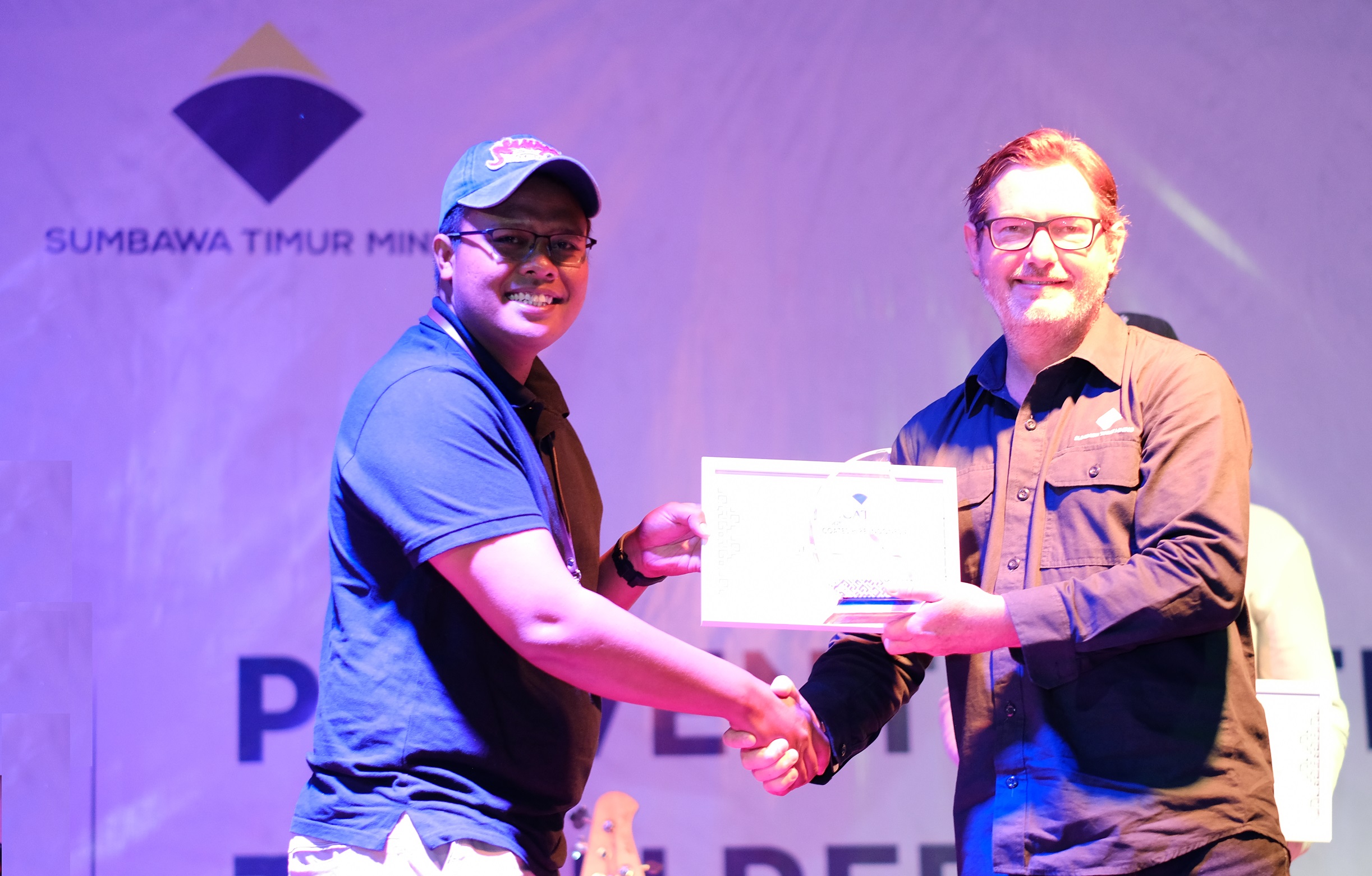 Presiden Direktur PT. STM, Bede Evans (kanan) saat memberikan penghargaan kepada salah satu kontraktor untuk dukungannya terhadap pelaksanaan penerapan kerja perusahaan