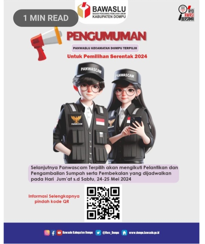 Pengumuman lengkapnya dapar diunduh di👉 https://dompu.bawaslu.go.id/wp-content/uploads/2024/05/PENGUMUMANNAMAPANWASCAMTERPILIH2024_fe80f9c5c4204706912cf26c1ca961c1.pdf