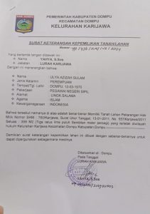 Sertifikat tanah tersebut berlokasi di wilayah hukum Kelurahan Karijawa, Kecamatan Dompu, dengan Nomor. SHM 760/Karijawa dan Surat Ukur Tanggal 13-01-2011 No. 557/ Karijawa, Tahun 2011, dengan Luas 359 M².