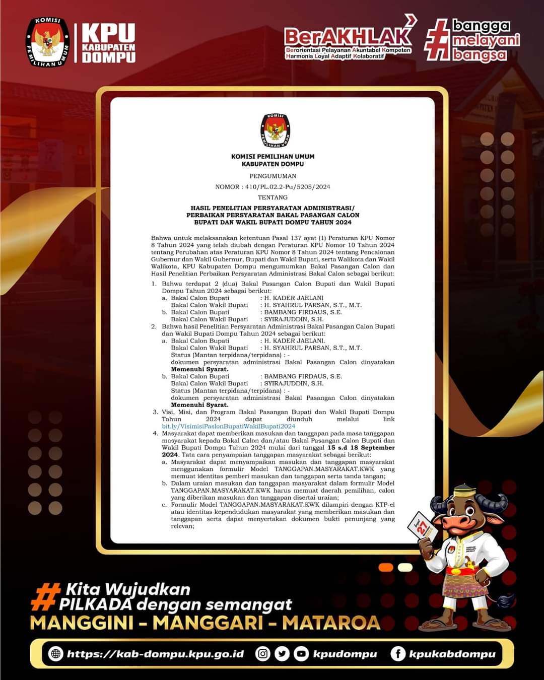 Dompu – Komisi Pemilihan Umum (KPU), Kabupaten Dompu, mengumumkan hasil penelitian administrasi bagi pasangan calon (Paslon) bupati dan wakil bupati. Kedua paslon dinyatakan memenuhi syarat (MS) dan dinyatakan lengkap. Dalam pengumuman itu, KPU juga meminta tanggapan atau masukan dari masyarakat.