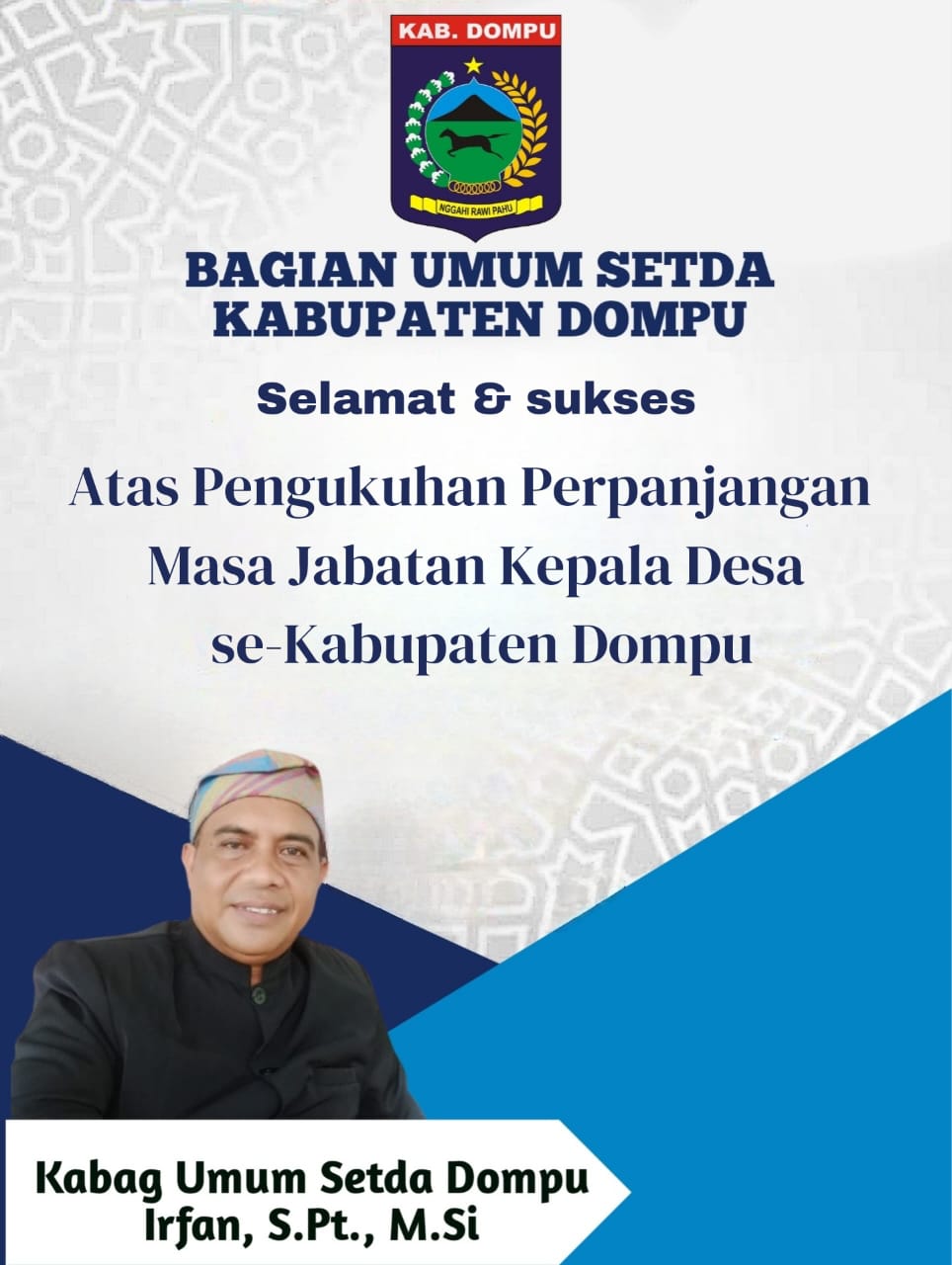 <h3 style="text-align: center;"><strong>Kepala Bagian Umum Setda Kabupaten Dompu</strong></h3> <h4 style="text-align: center;"><strong>Mengucapkan</strong></h4> <h4 style="text-align: center;"><strong>Selamat & Sukses</strong></h4> <h4 style="text-align: center;"><strong>Atas Pengukuhan Perpanjangan Masa Jabatan 36 Kepala Desa, Kabupaten Dompu</strong></h4> <img class="alignnone size-medium wp-image-6668 aligncenter" src="http://ntbpress.com/wp-content/uploads/2024/09/IMG-20240929-WA0006-226x300.jpg" alt="" width="226" height="300" />