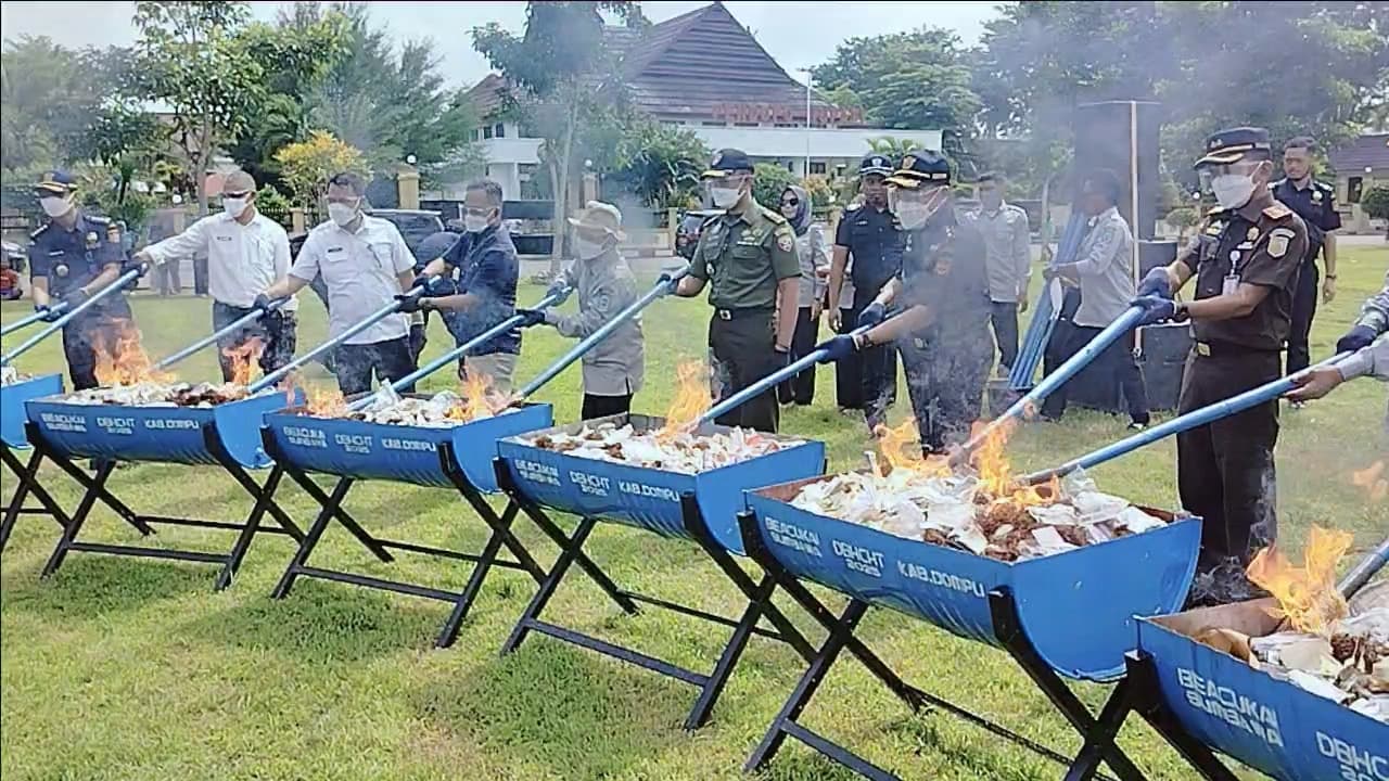 Dompu – Kantor Bea Cukai Sumbawa, Nusa Tenggara Barat (NTB), memusnahkan barang ilegal hasil sitaan tahun 2024 di Kabupaten Dompu, Rabu (21/5/2025). Barang yang dimusnahkan di halaman kantor Bupati Dompu yakni rokok, minuman mengandung etil alkohol (MMEA) dan tembakau iris dengan merugikan negara sebesar Rp 644 juta.